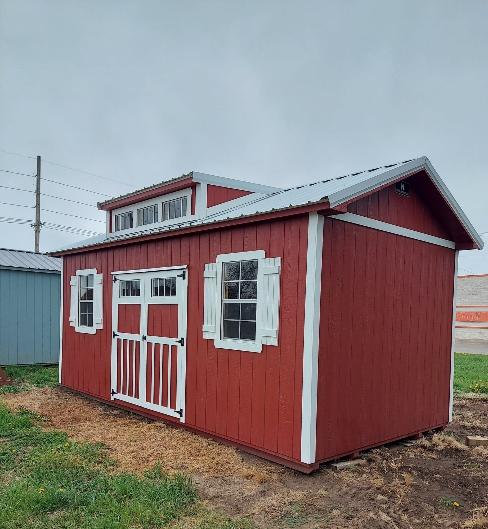 Check out our sensational new 10×20 Villa shed! This 10×20 Red Painted Villa has a white metal roof and white trim. It comes with 70″ double doors with 2 transom windows, 2 2×3 windows with shutters, 8 foot Dormer, and 2 lofts. This building is also comes with a 10 inch overhang on both sides of the building.